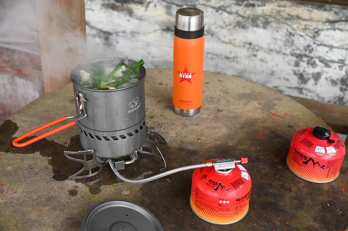 山顶是一座古老的寺庙,仅有一位来自广西的信士在此修行。寺庙帮我们解决了水源问题,带上来的肉和路上采集的野货,就是我们丰盛的午餐,后勤队长兵哥还“偷偷”的采了几根寺庙种的大葱。