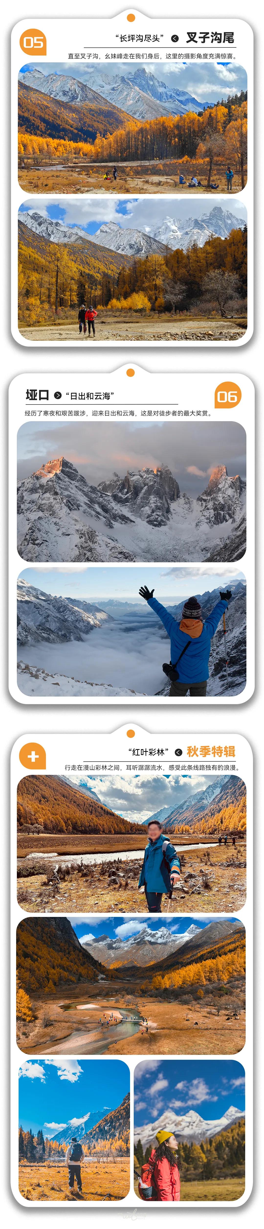 今天体力要求相对较大,凌晨3点左右出发,大家做好准备从营地到垭口大约6km,开始的一段路非常陡峭,需要倍加小心,后面坡度稍缓一些,在经过一个大平台之后,垭口就在眼前了。约4小时左右抵达垭口,天气好可以看到日出日照金山以及壮观的云海,翻越垭口,一路下坡,到磐羊湖坐电瓶车到毕棚沟售票处,再坐观光车到景区入口处,坐上在此等候我们的车辆,离开毕棚沟,预计当天晚上20:30抵达成都。