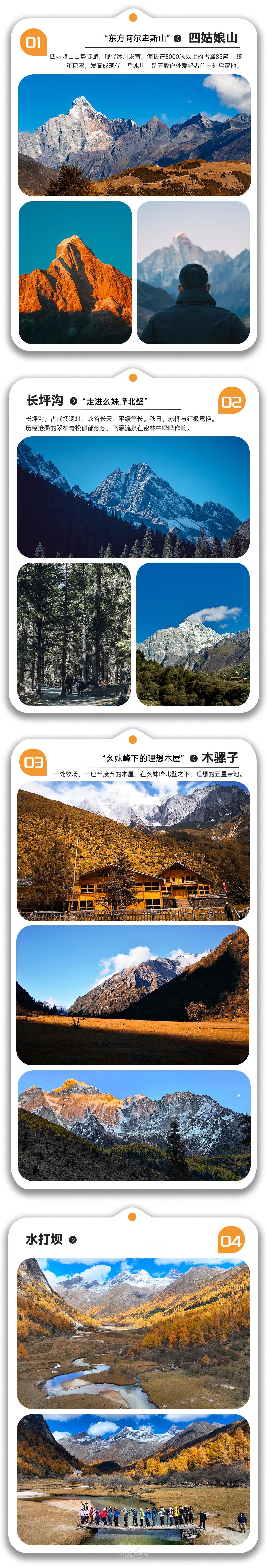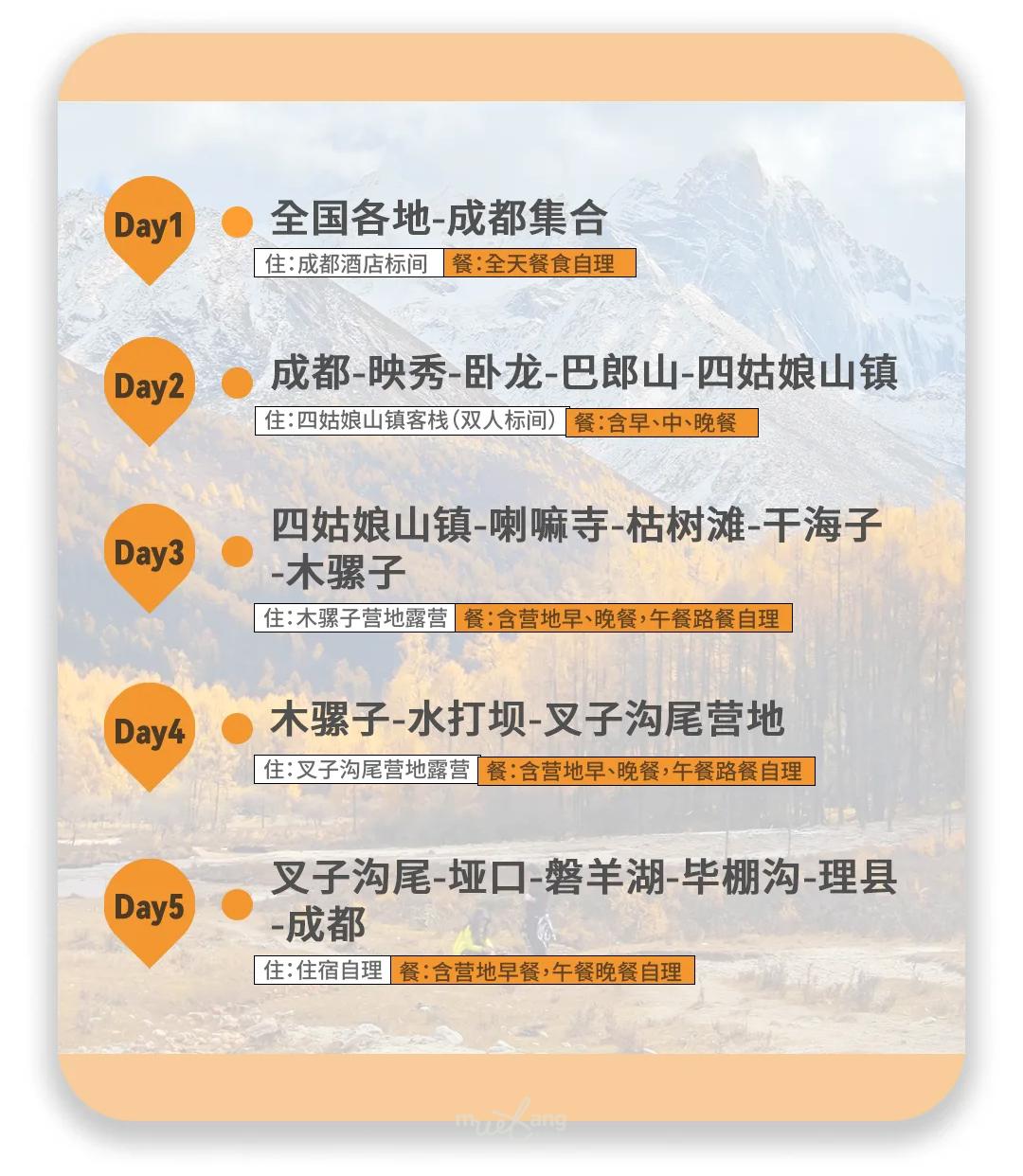 餐饮:四姑娘山镇早餐、午餐(路餐自理)、营地晚餐