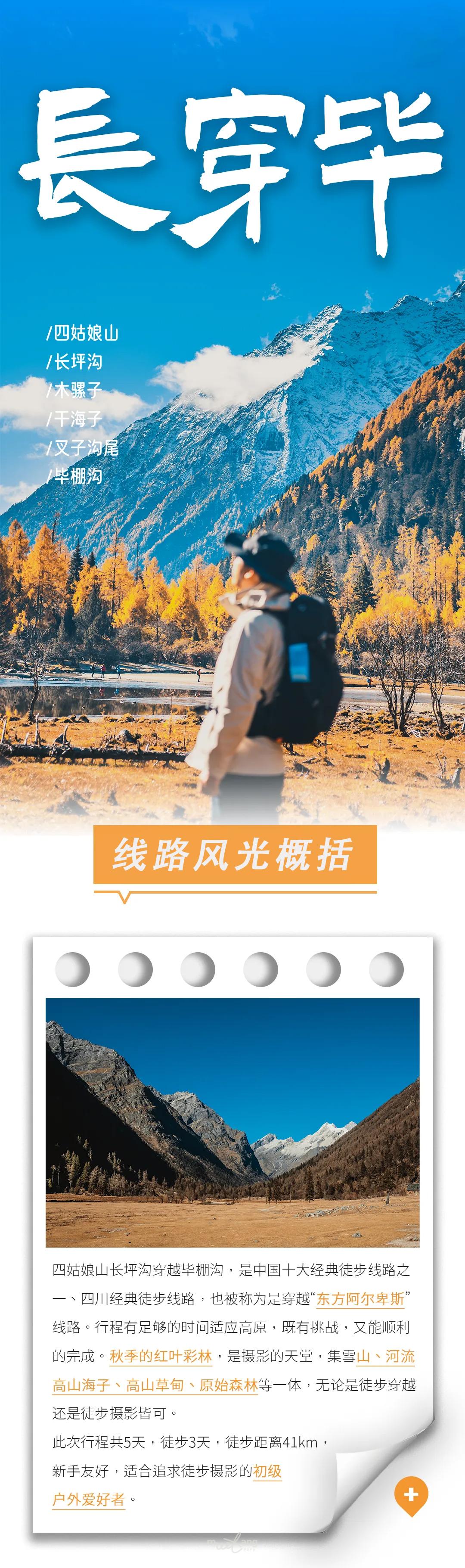 四川长坪沟穿越毕棚沟,简称长穿毕,是中国十大经典徒步路线之一,有“东方阿尔卑斯山”之称,是专属户外徒步人的入门小长线。在这里徒步场景丰富,穿越原始森林,漫步河谷,穿越沼泽,翻越垭口,体验多种路况。此路线一步一景,四季各有不同。