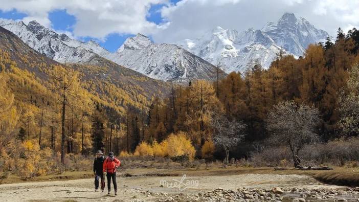 乘观光车进入长坪沟,抵达喇嘛寺后,就开始我们为期三天的徒步穿越行程,长坪沟全长29公里,面积约为100平方公里,峡谷长天、平缓悠长,四姑娘山就坐落在沟内16公里处。长坪沟景区内有古柏幽道、喇嘛寺、干海子及数十米高的飞瀑,并有奇石之景。夏天,山花与油菜花齐开;秋日,赤桦与红枫竞艳。历经沧桑的翠柏青松郁郁葱葱,飞瀑流泉在密林中哗哗作响,古代驿路在茫茫林海里穿梭延伸。中午在干海子稍作休息并解决午餐(路餐),当天晚上在四姑娘山幺妹峰脚下的木骡子营地露营。