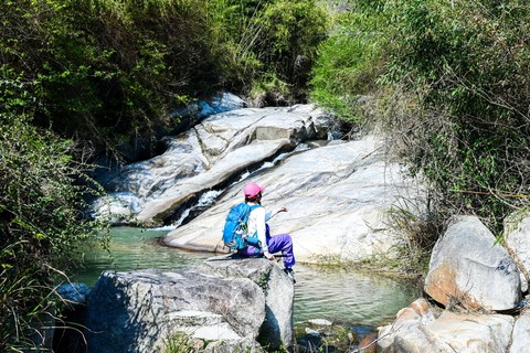沿着古道石阶而上,身旁就是悠长的峡谷,流水声不绝于耳。在这里专心徒步,耳朵里听到的,全是山林里的风声、流水声、鸟叫声;眼睛里看到的,全是青翠的草木以及点缀在山间的野樱花、杜鹃花;还有鼻子里闻到的淡淡花香、淳厚的松针香味。这真的是条极度沁人心脾的线路。