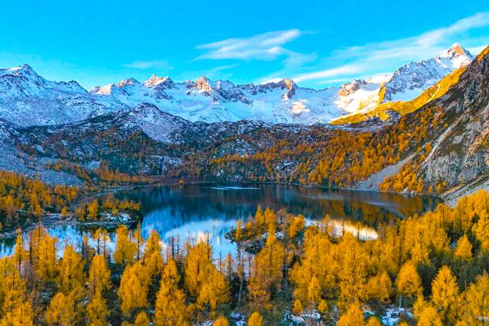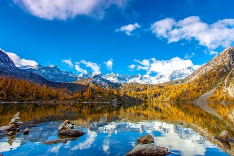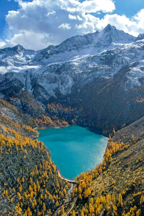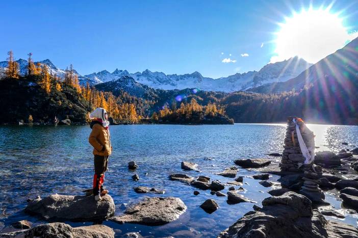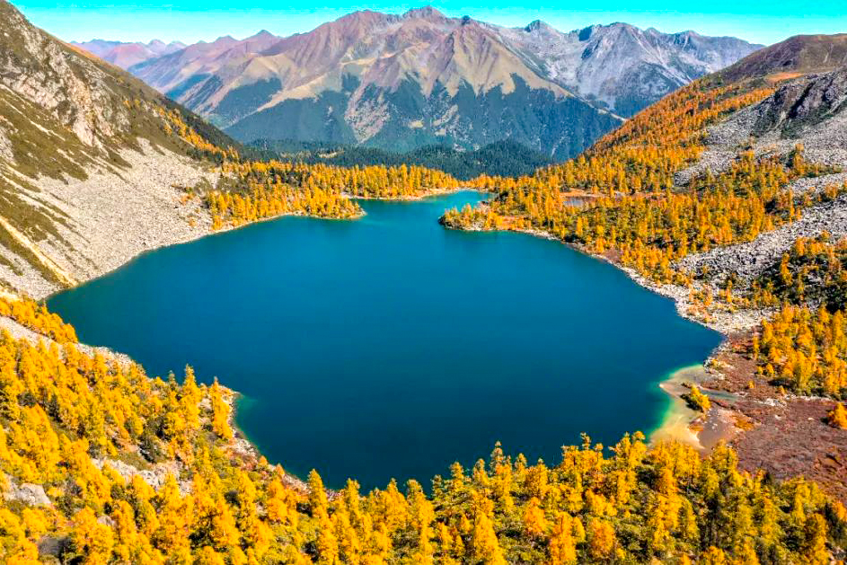 甲伊拉措,海拔4100米,位于葫芦海北侧的山谷中,甲伊拉措有着令人惊艳的青蓝湖色,仿佛一颗硕大的绿松石,其周围遍布森林和雪山,秋季彩林斑斓,如诗如画、美不胜收。神山圣湖相交映遇见山间森林,拥抱自然恰如闯进一场动植物王国的梦境。
