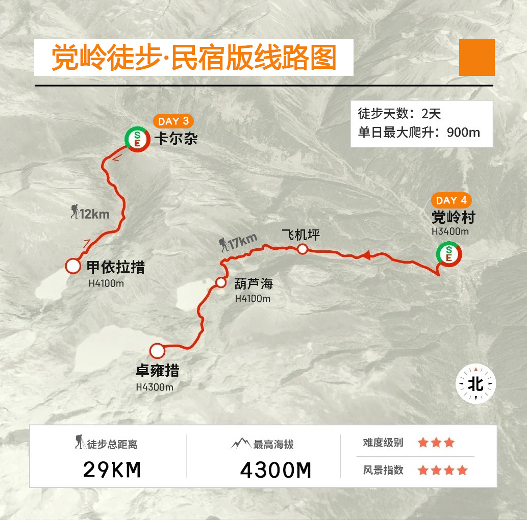 住民宿版:总徒步29公里,第3、4天为往返徒步线路,每天回到党岭村民宿住宿(海拔3400米),徒步线路最高海拔:卓雍措4300米。