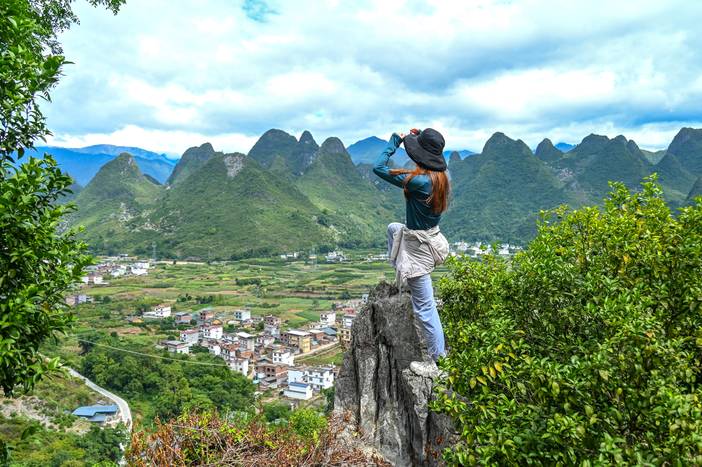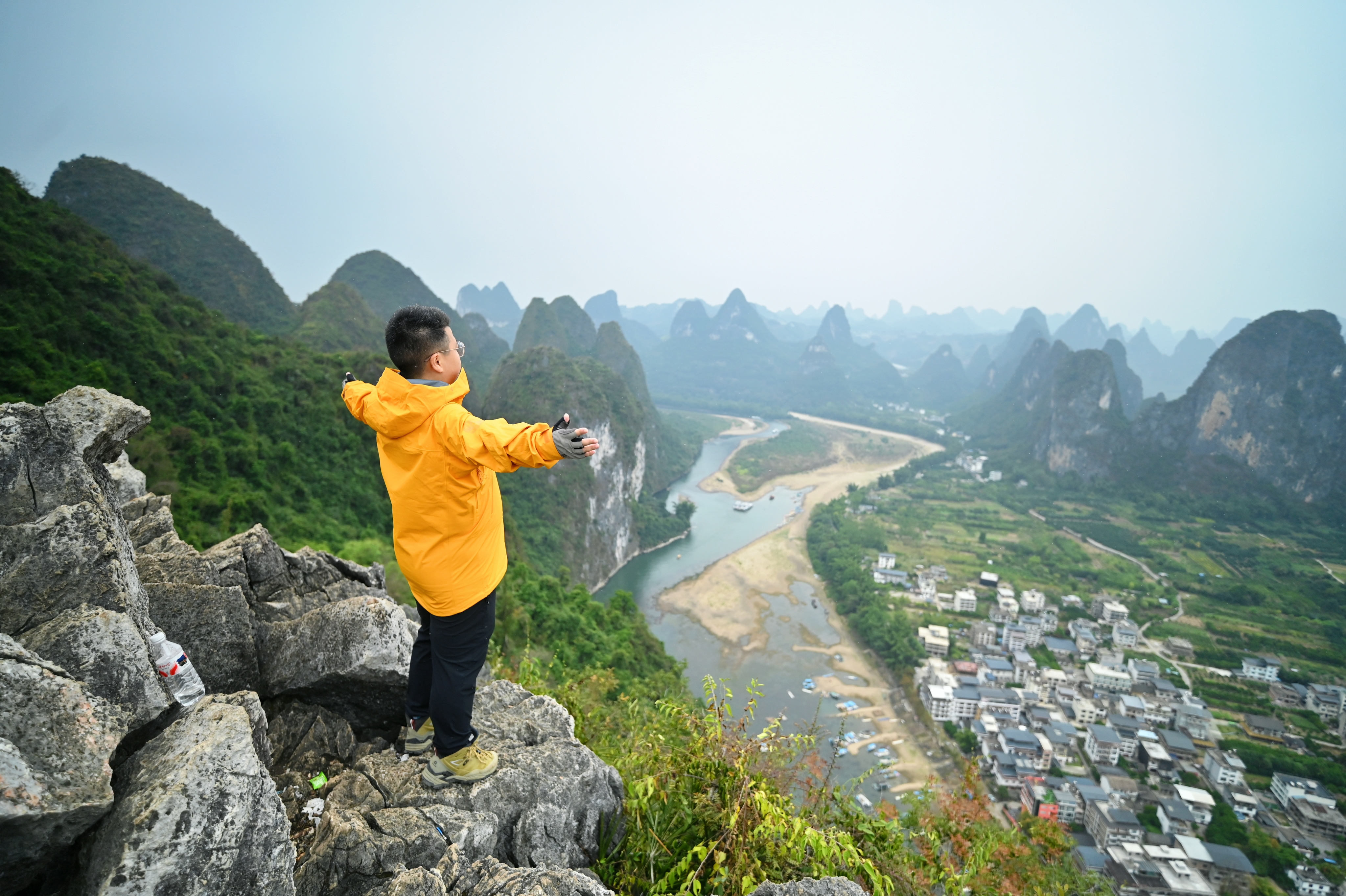 09:30 开始攀爬老寨山,山路崎岖陡峭,一路攀爬向上,多巴胺分泌旺盛,注意小心脚底打滑,但是山顶的风光会让你惊叹不已!站在老寨山顶,可以一览漓江大拐弯的绝美盛景!