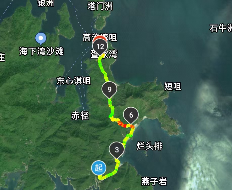 第1天:深圳罗湖口岸-港铁大学站-西湾亭(开始徒步)-西湾-咸田湾-大浪湾-东龙二峯-高流湾(坐船)-塔门岛(露营),徒步13公里