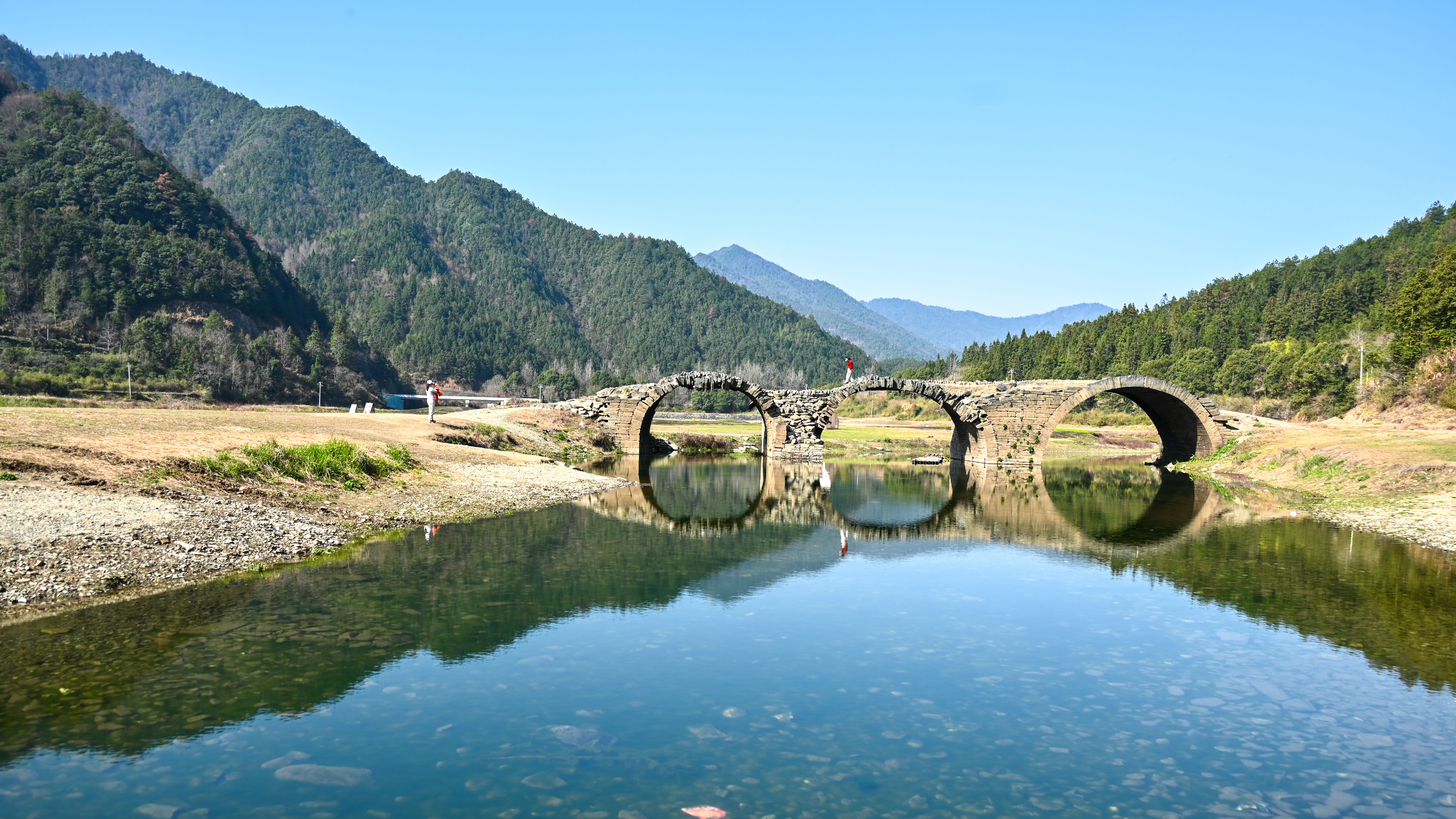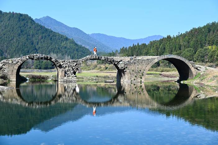08:30 坐车前往官坑村徒步起点,途经段莘水库,临时下车打卡历史悠久的“三眼桥”,湖边也很适合漫步拍照。