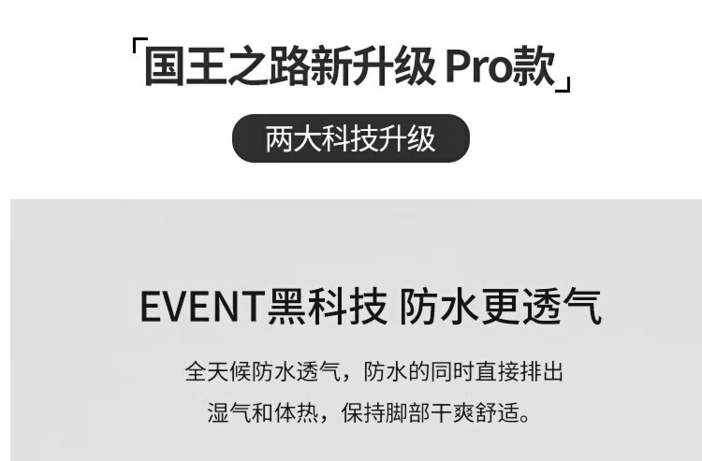 这双徒步鞋是在通用款的基础上,将防水鞋套升级成与Gore-tex(戈尔面料)防水性能媲美的event科技面料(透气性可能比gore-tex更好);