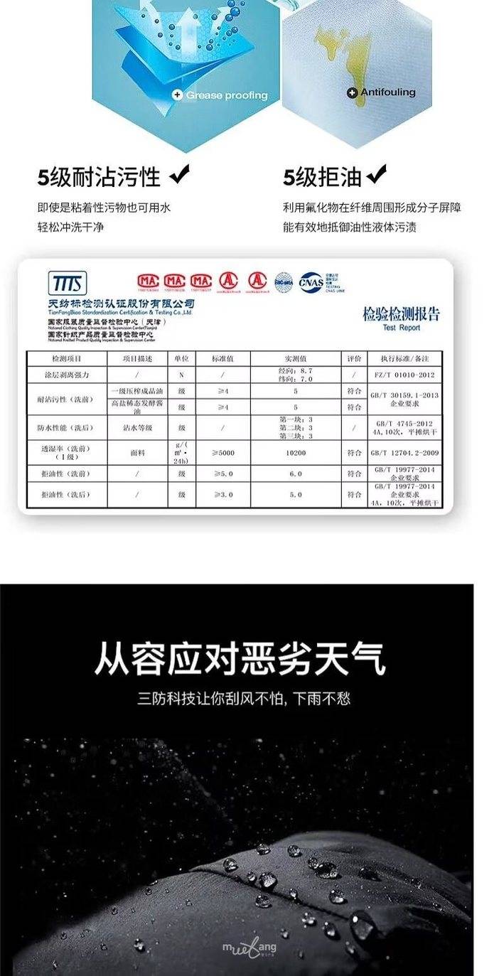 4、指数: 面料:表面抗湿性:≥4级;拒油性:≥4级;耐沾污性:≥4级。